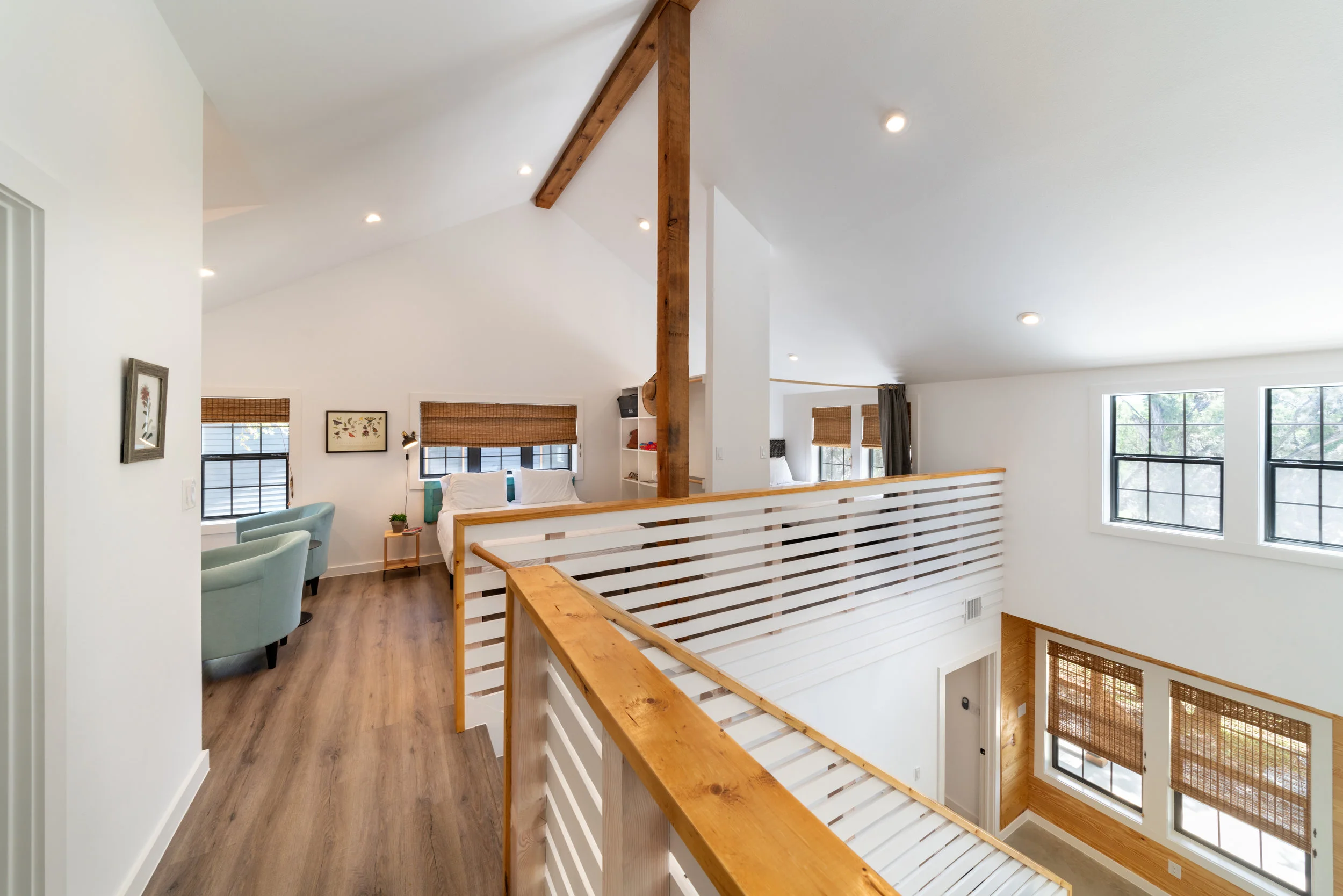 A queen bed in a semi-private loft overlooking the downstairs living room. A double-vanity full bathroom is available. The Cantina Lofts have two stories, Downstairs you will find the main living area complete with a TV, the two private master bedrooms, a spacious kitchen with a dishwasher and a double-vanity bathroom. Upstairs, there's another TV area and two queen beds in a semi-private loft overlooking the downstairs living room. A room with 2 sets of twin bunk beds is also situated upstairs. There's an additional double-vanity full bathroom upstairs. The Cabins are situated a short distance from the pool and have a stellar river view. These rooms are priced per person for double occupancy. This room is ideal for a couple or friends who will share a queen bed or share the room as one queen bed. To select these rooms as single occupancy there is a $200 additional fee added to your bill upon booking.